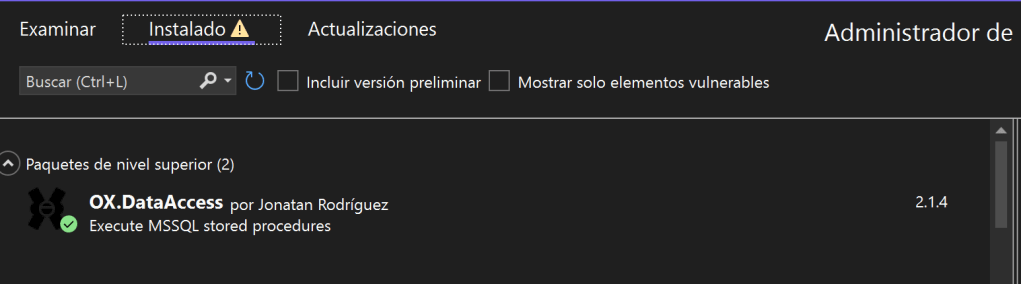 El paquete lo encontraras tecleando «OX.DataAccess» en el gestor de paquetes de NuGet de la siguiente manera:
